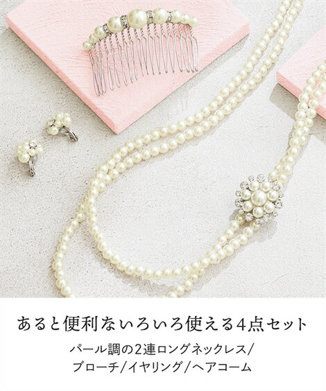 原産国 中国製 メーカー品番 ZZY4321A3170 コメント ・パール調の2連ロングネックレスとブローチ、イヤリング、ヘアコームのお得な4点セットです。